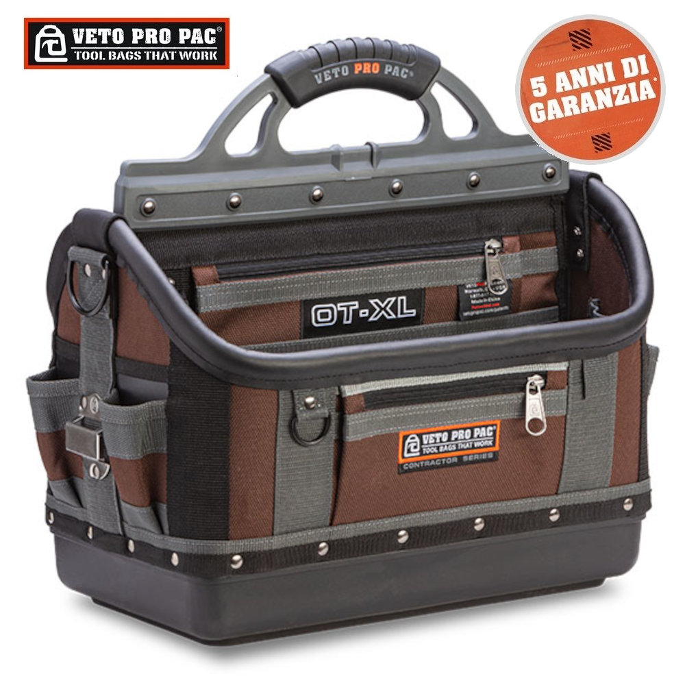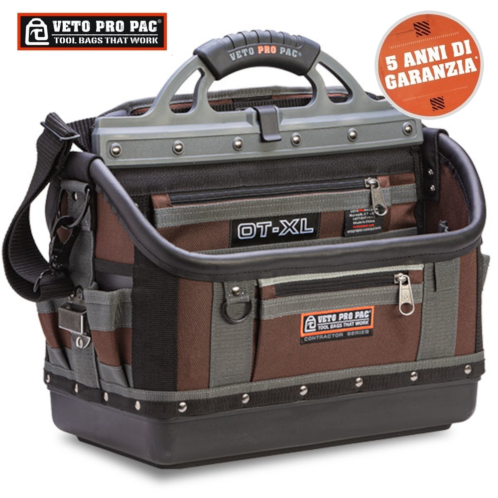VETO PRO PAC - OT-XXL BORSA APERTA PORTA UTENSILI PER APPALTATORI - 5 ANNI DI GARANZIAL'OT-XXL è il 'Trasporto Lungo' di Veto con un massimo di 63 cm all'interno per qualsiasi cosa, da una squadra di inquadratura, alle livelle di 62 cm,alle chiavi per tubi, alle seghe a mano, ai martelli da carpenteria, alle prolunghe, alle barre di demolizione, ai freni per intelaiatura portatili... tutto quello che volete!SPECIFICHE DEL PRODOTTO:Altezza (A): 12,5' (32 cm)Altezza della maniglia (HH): 18 '(46 cm)Larghezza (L): 28' (71cm)Profondità (D): 11,5' (29 cm)Peso (vuoto): 14 libbre/6,5 kgVolume interno: 2270in3/37LCarico utile massimo: 50 libbre / 23 kgCAPACITÀ DI STOCCAGGIO UTENSILI MASSIMA:48 tasche interne ed esterneTracolla imbottitaClip per nastro in acciaio inossidabile montata esternamenteAnelli a D in acciaio: 2 grandi e 4 piccoliImpugnatura ergonomica sovrastampataBase in plastica polipropilene impermeabileTasche con cerniera YKK®Garanzia limitata di 5 anniCodice prodotto: AX3590