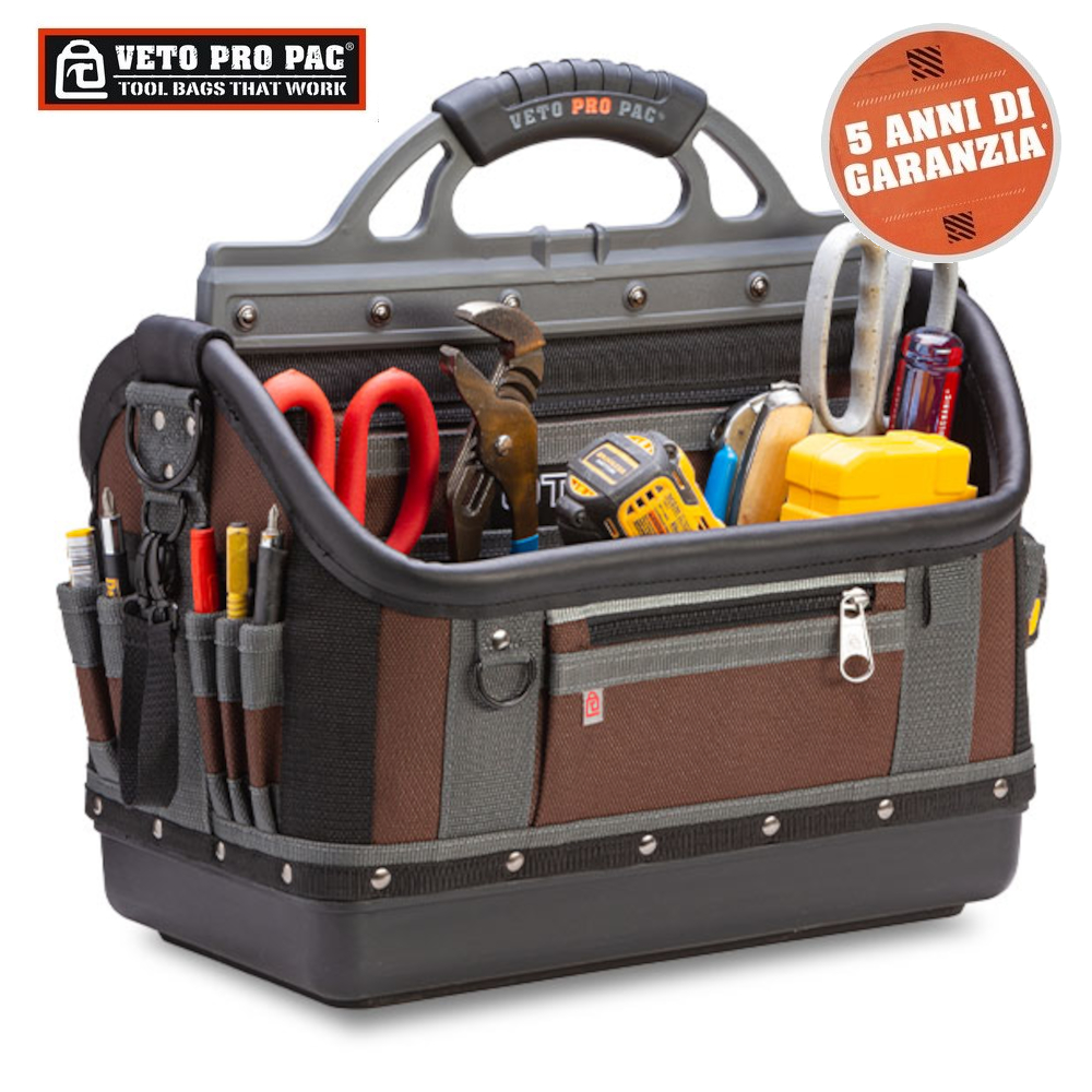 VETO PRO PAC - TECH XL BORSA PORTA ATTREZZI - 5 ANNI DI GARANZIA Tech XL è la versione per il tecnico della premiata sacca XL per attrezzi di Veto Pro Pac. TECH-XL vanta 80 tasche con ampio spazio per attrezzi manuali, scatole per ricambi, misuratori, un trapano cordless a percussione ed altri oggetti più ingombranti. CARATTERISTICHE: • Sacca per attrezzi di ampie dimension • Tracolla imbottita che si aggancia all’impugnatura • Heavy duty fastenings and zips • 80 tasche interne ed esterne per attrezzi • 5 anni di garanzia • Base impermeabile (3mm polypropylene) • Tessuto della borsa resistente alle intemperie (Tessuto in PVC da 1800 D) SPECIFICHE: Larghezza 241 mm (9.5”) Lunghezza 419 mm (16.5”) Altezza 527 mm (20.75”) (380 mm con impugnatura abbassata) Peso 4.2 kg (9.4 lbs) Numero di tasche 80 Codice prodotto: AX3503