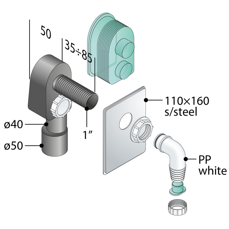 SIFONE ribassato in PP - TEA Mosquito per bidet - attacco 1″1/4 CARATTERISTICHE: Sifone in PP entrata H. 200 × 1”¼ uscita L. 300 × ø40 rosone PP ø78 Codice prodotto: 2322.244.6