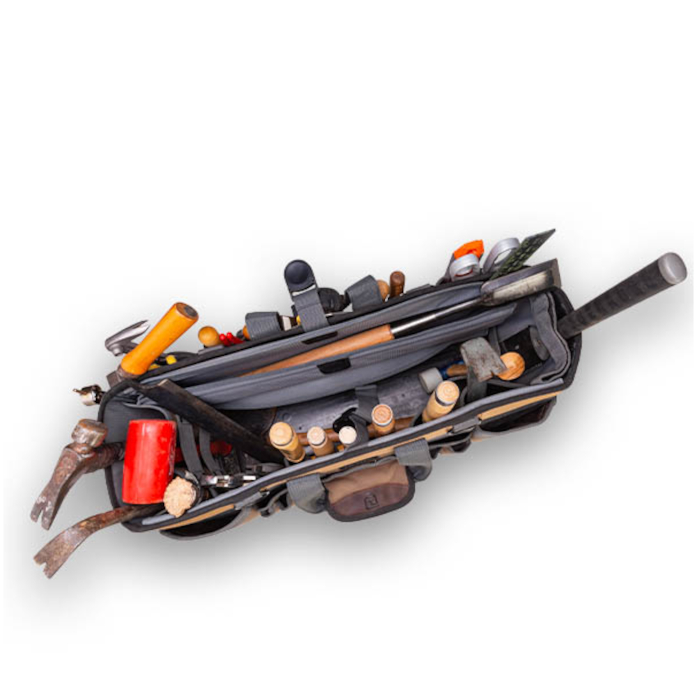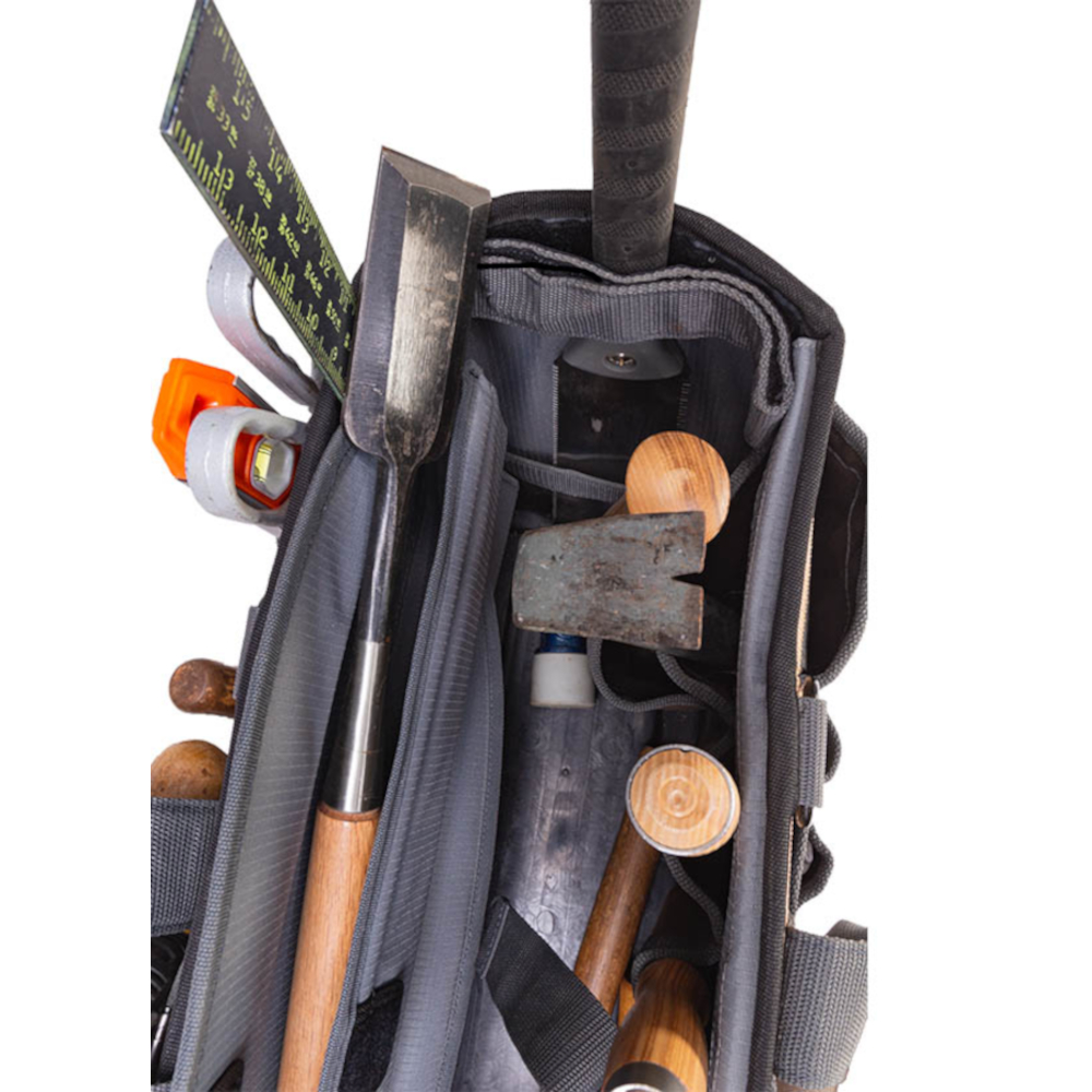 Con 2 tasche orizzontali e una serie di tasche verticali esterne per gli attrezzi, la TF-XXL è stata progettata da zero per l'arte dell'intelaiatura in legno. Con un'impronta di 23 X 65 cm, la borsa può contenere facilmente una squadra per intelaiatura, una livella da 61 cm e altri attrezzi manuali spesso necessari per assemblare e montare un edificio a struttura in legno. Ideale anche come borsa porta attrezzi per qualsiasi mestiere.