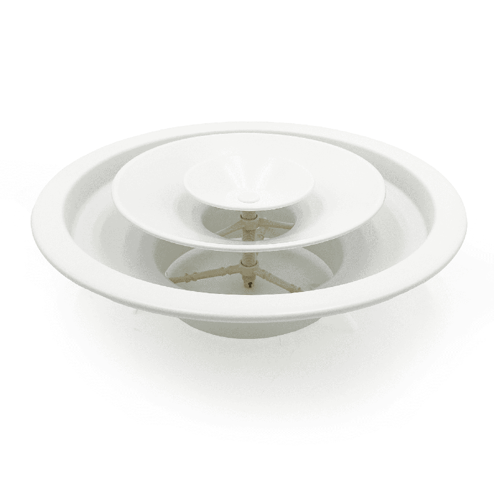 DIFFUSORE CIRCOLARE CON CONI REGOLABILI Ø 160mm in Alluminio Biancocon vite millimetrica di regolazione e serranda integrata Caratteristiche:- Diffusore circolare a coni mobili- Costruzione in allumino verniciato bianco fissaggio con fori sul collo diffusore• Regolazione a mezzo vite micrometrica dei singoli coni• Regolazione in ABS• Diametro 160 su pannello 600x600 mm per controsoffitti modulari.• Regolazione frontalmente al diffusore• Altezza di installazione compresa tra 2,6 e 6,0 m• Serranda di taratura a spicchi • Regolabile dall’esterno agendo sul cono cieco centraleCodice prodotto: DC.60160