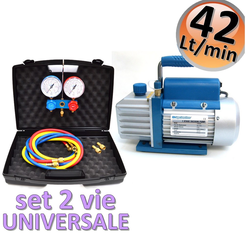POMPA DEL VUOTO MONOSTADIO 42 LT CON VACUOMETRO eD ELETTROVALVOLA + SET MANOMETRICO A 2 VIE con scale R410A - R32 - R407C - R134A CARATTERISTICHE: POMPA VUOTO: ISTRUZIONI IN ITALIANO MODELLO MONOSTADIO DA 42 LITRI MINUTO FORNITA DI VACUOMETRO PER VISUALIZZARE L'OPERAZIONE DEL VUOTO FORNITA DI ELETTROVALVOLA PER EVITARE RITORNI D'OLIO IN CASO DI BLACK-OUT ACCIDENTALE. DOTATA DI INTERRUTTORE ON-OFF INDICATORE DEL LIVELLO DELL'OLIO 1 CONFEZIONE DI OLIO COMPRESA CAVO DI ALIMENTAZIONE CON SPINA SHUKO MANIGLIA ERGONOMICA DI TRASPORTO DATI TECNICI: MODELLO MONOSTADIO CAPACITA' DI ASPIRAZIONE IN LITRI AL MINUTO 42 POTENZA MOTORE 1/4 HP ALIMENTAZIONE 220 V - 50Hz VUOTO FINALE 3 Pa OLIO NELLA POMPA 310 ML. DIMENSIONI 290X160X240 (mm) PESO 6,70 KG ATTACO 1/4' SAE CERTIFICATA CE SET MANOMETRICO UNIVERSALE 2 VIE: MANOMETRI UNIVERSALI A 2 VIE, CON SCALE GAS R410A - R32 - R407c - R134A DIAMETRO MANOMETRI 80 mm 3 FRUSTE 1/4 x 1/4 sae - LUNGHEZZA 150 cm 2 RACCORDI RIDOTTI 1/4 sae M x 5/16 F Codice prodotto: KT.42M2