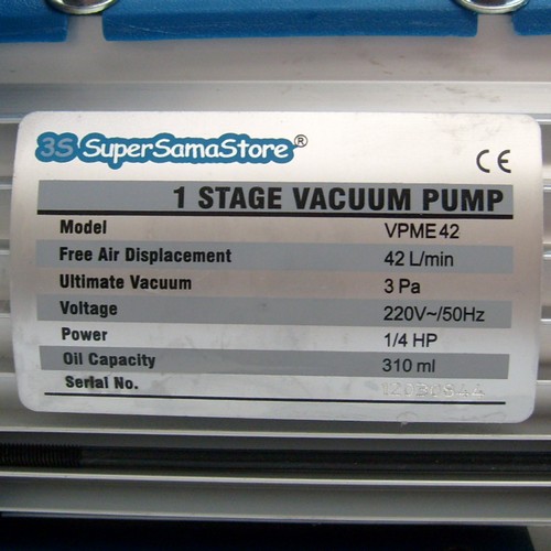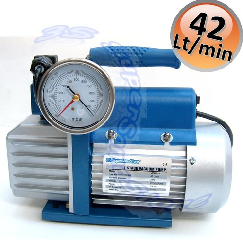 POMPA VUOTO 42 Lt/min con vacuometro e rubinetto Il kit comprende: - Pompa del vuoto da 42 lt/min con vacuometro e rubinetto chiuso/aperto - 2 mt di tubazione vinilica D. 6/9 mm (interno/esterno) - Raccordo portagomma sulla pompa POMPA del VUOTO: ISTRUZIONI IN ITALIANO e INGLESE MODELLO MONOSTADIO DA 42 LITRI MINUTO FORNITA DI VACUOMETRO con RUBINETTO DI CHIUSURA PER VISUALIZZARE L'OPERAZIONE DEL VUOTO DOTATA DI INTERRUTTORE ON-OFF INDICATORE DEL LIVELLO DELL'OLIO 1 CONFEZIONE DI OLIO COMPRESA CAVO DI ALIMENTAZIONE CON SPINA SHUKO MANIGLIA ERGONOMICA DI TRASPORTO DATI TECNICI: MODELLO MONOSTADIO CAPACITA' DI ASPIRAZIONE IN LITRI AL MINUTO 42 POTENZA MOTORE 1/4 HP ALIMENTAZIONE 220 V - 50Hz VUOTO FINALE 3 Pa - 0,03 mbar OLIO NELLA POMPA 310 ML. DIMENSIONI 290X110X240 (mm) PESO 6,20 KG ATTACO 1/4' SAE CERTIFICATA CE Codice prodotto: KT.VM42