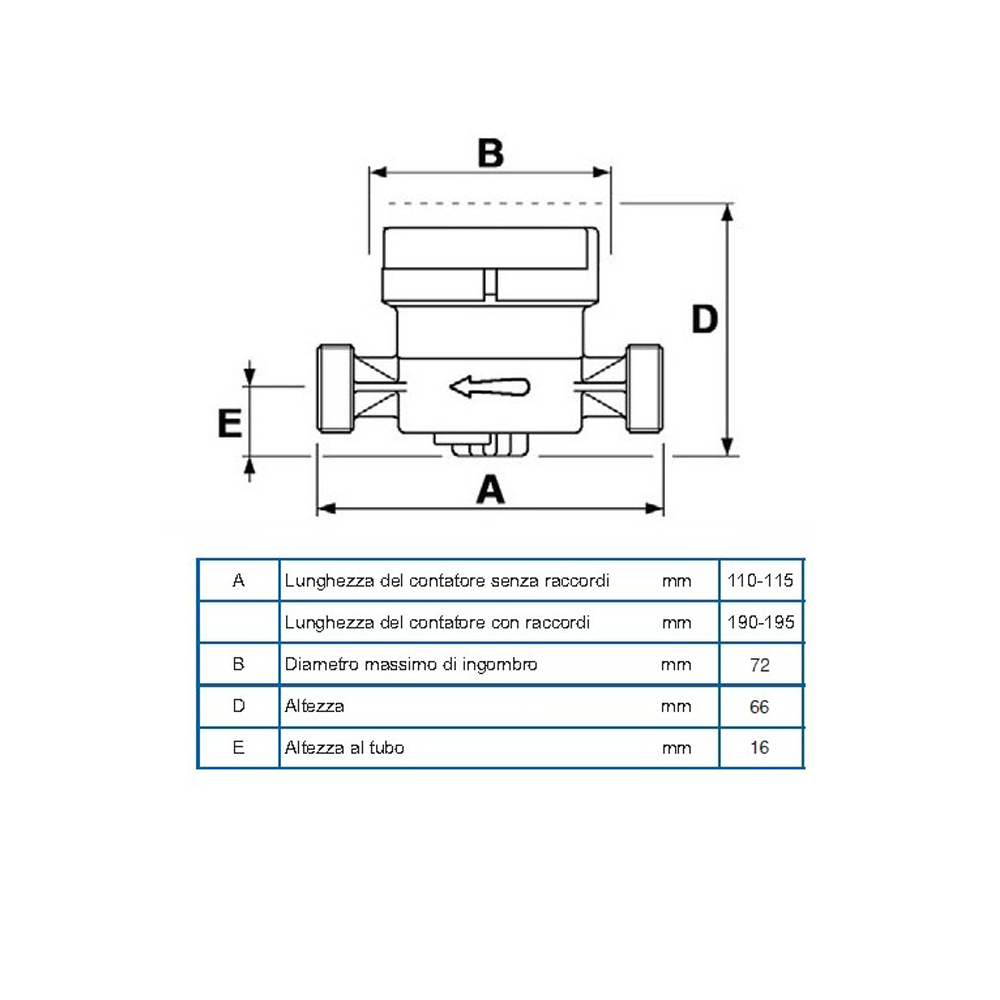 CONTATORE ACQUA CALDA - ATTACCHI 1/2' maschio - maschio quadrante asciutto - omologato CEE CARATTERISTICHE: Contatore per acqua fredda a getto unico • Quadrante asciutto • Lettura diretta - orologeria orientabile 360° • Omologato CEE • Completo di raccordi di collegamento maschio/femmina con rollino e guarnizioni • Per acque torbide, calcaree e con sedimenti in sospensione: nessun ruotismo immerso e quadrante secco Proprieta` Diametro 1/2” Portata max 3 m3 Portata normale 1,5 m3/h Portata minima 30 l/h Pressione max 16 bar Temperatura funzionamento 0 - 30 °C Codice prodotto: S12SS98CB001