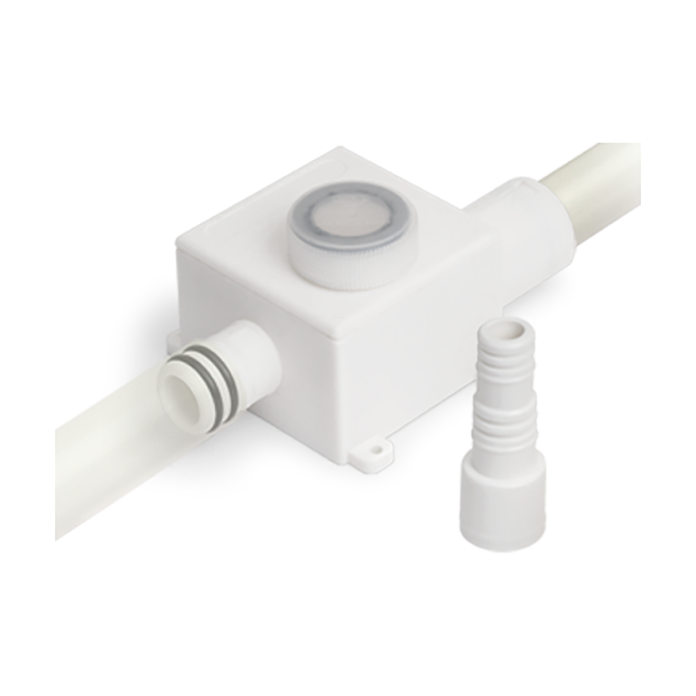 SIFONE A SECCO ISPEZIONABILE per climatizzatore - con scatola da incasso CARATTERISTICHE: I sifoni sono stati studiati per eliminare i cattivi odori provenienti dal tubo di scarico condensa, uno dei maggiori problemi nelle predisposizioni degli impianti di condizionamento. Molti sifoni vengono montati all’interno delle pareti e murati, senza poter essere successivamente ispezionati. Questo sifone a secco è stato progettato e realizzato con le seguenti innovative caratteristiche: • Possibilità di ispezione, in quanto montato all’interno di un’apposita cassetta, apribile dall’esterno, e verifica di eventuali anomalie di montaggio od ostruzioni provocate da insetti; • Due entrate e due uscite orizzontali e verticali, che consentono l’installazione a destra e a sinistra, indipendentemente dal posizionamento; • Trasparente, permette la verifica visiva del funzionamento dell’impianto e la regolare produzione di condensa. KIT Sifone a secco DOUBLE • Sifone con tappo ispezionabile e sfera • Guarnizione tecnica • O-ring di tenuta • Scatola con coperchio e viti Sifone a secco DOUBLE Con entrata e uscita orizzontale e verticale completo di guarnizione tecnica O-ring. Scatola multifunzione ispezionabile Scatola con coperchio da incasso per l’alloggiamento del sifone a secco fornita con viti. Codice Prodotto: KSD.001