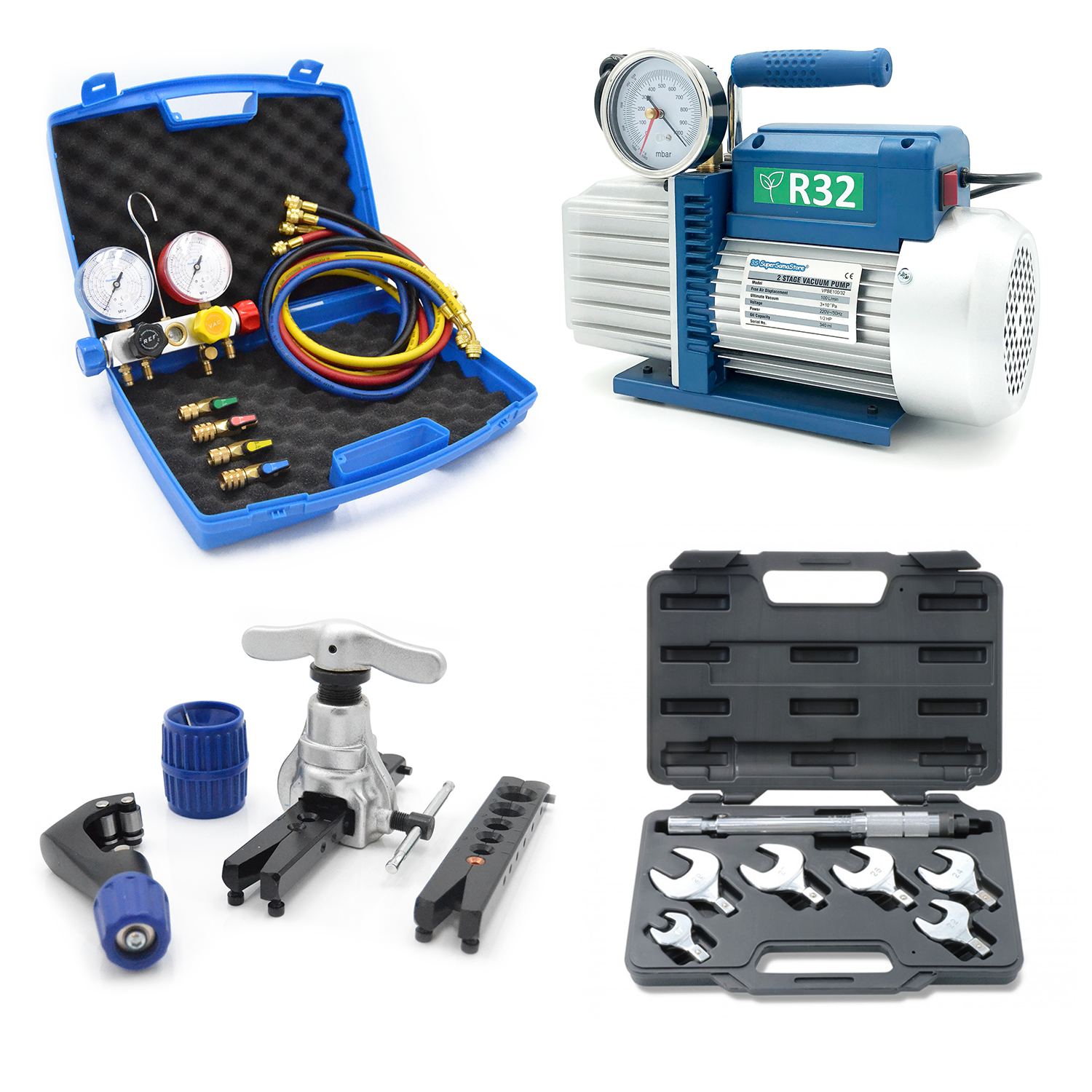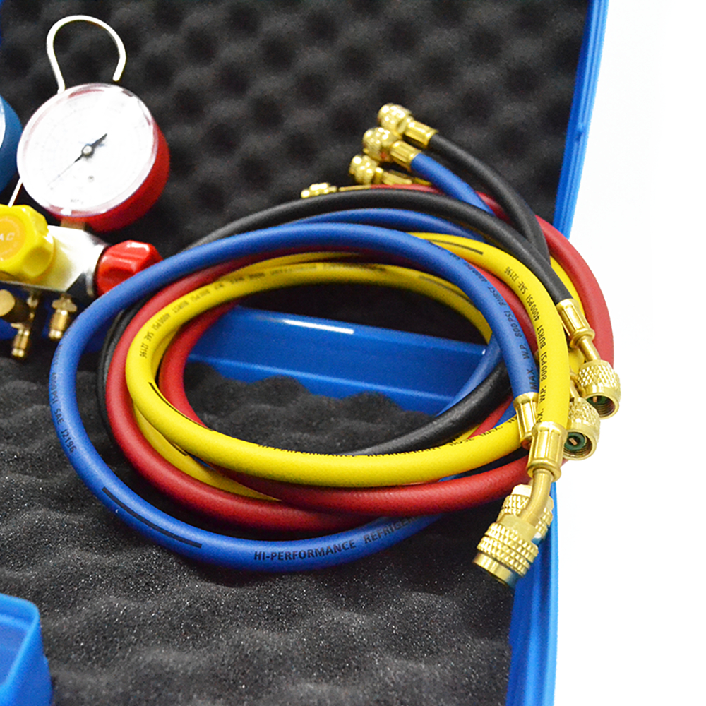 - Gruppo manometrico con 4 rubinetti (blu – nero – giallo – rosso) su corpo in alluminio