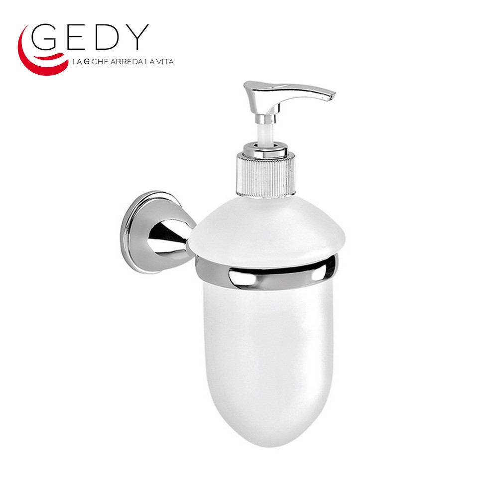 Dosasapone Edera - GEDY Caratteristiche: Misure 11,4 x 9,8 x 15,2 cm; Realizzato in ottone, cromall e vetro satinato; Erogatore in metallo; Finitura cromata lucida. Codice prodotto: ED81