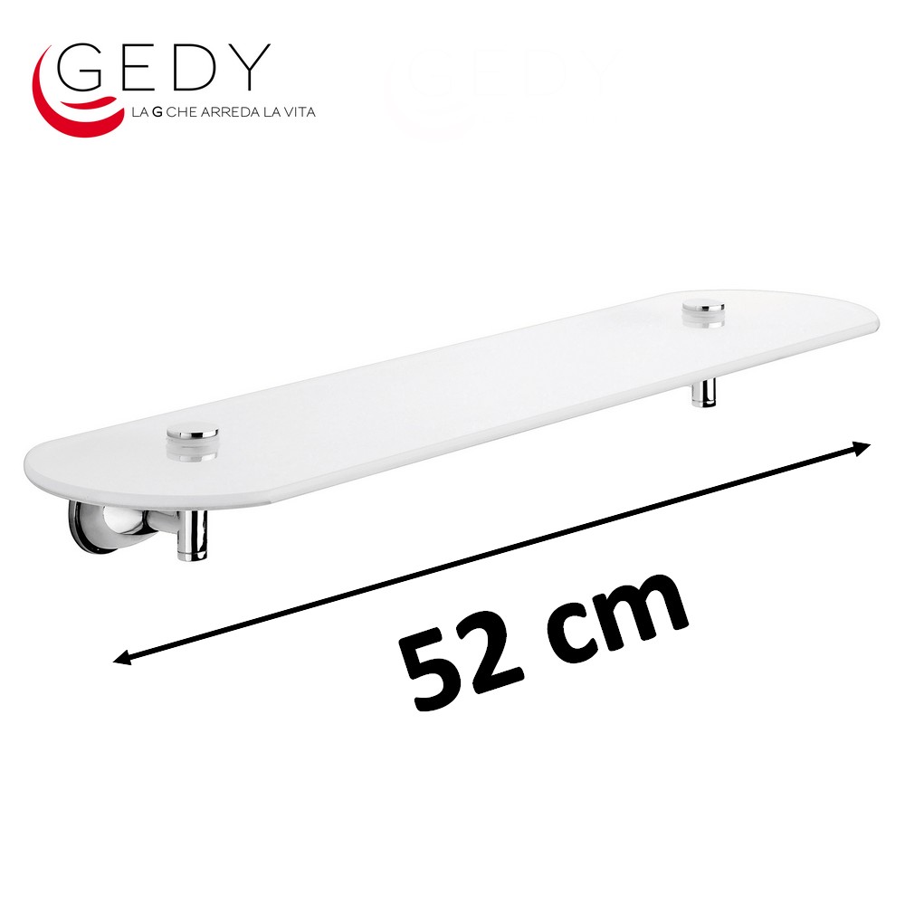 Mensola cm 55 FELCE - GEDY Caratteristiche: Dimensioni: 52 x 13,5 x 5,7 cm; Struttura realizzata in Cromall© e acciaio; Mensola in vetro satinato Portata MAX 7,5 Kg; Fissaggio a muro con viti. Codice prodotto: FE1955