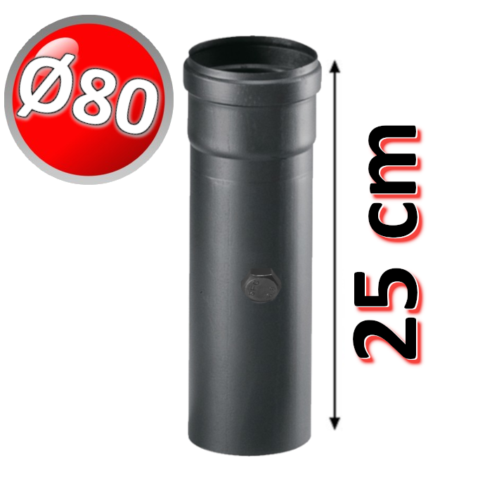 TUBO LINEARE 100 cm / M-F in PPs NERO - Ø 80mm CANNA FUMARIA per CALDAIE a CONDENSAZIONE CARATTERISTICHE: - PPs - nero - guarnizione in silicone triplo labbro. - Il sistema scarico fumi in PPs Nero nasce per essere utilizzato con apparecchi di tipo “C” a condensazione, tuttavia questo sistema può essere utilizzato con qualsiasi generatore di calore a combustibile gassoso o liquido dove sia garantito il non superamento della temperatura massima dei prodotti della combustione di 120°C. Può inoltre essere utilizzato per cappe da cucina e condotti di adduzione/estrazione aria, sempre con temperature che non superino i 120°C. Codice prodotto: PANED01D80