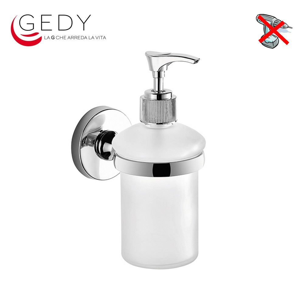 Dosasapone Edera - GEDY Caratteristiche: Misure 11,4 x 9,8 x 15,2 cm; Realizzato in ottone, cromall e vetro satinato; Erogatore in metallo; Finitura cromata lucida. Codice prodotto: ED81