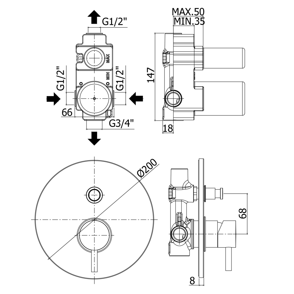 Miscelatore doccia incasso termostatico 3 uscite Modello LIGHT - PAFFONI Specifiche: Corpo completamente in ottone cromato; Maniglia termostatica con regolazione temperatura; Comprensivo di corpo incasso; 3 Uscite con deviatore; Piastra cromata tonda 200mm in ABS; 100% MADE IN ITALY. Codice prodotto: LIQ019-CR