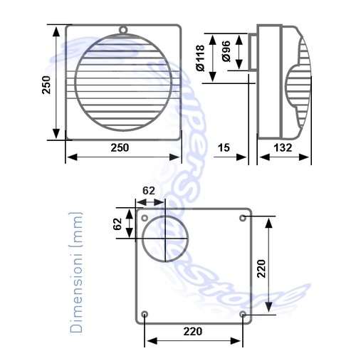 Aspiratore centrifughi predisposti per espulsione dell'aria in condotto e installazione a parete e a soffitto, modello standard.