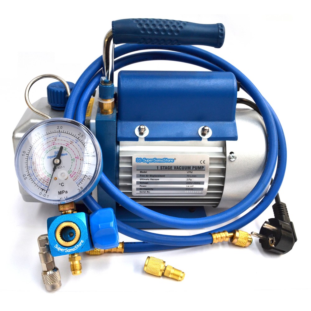 Il set comprende tutto il necessario per effettuare il vuoto nell’impianto e verificare la tenuta della depressione, grazie al manometro-vacuometro