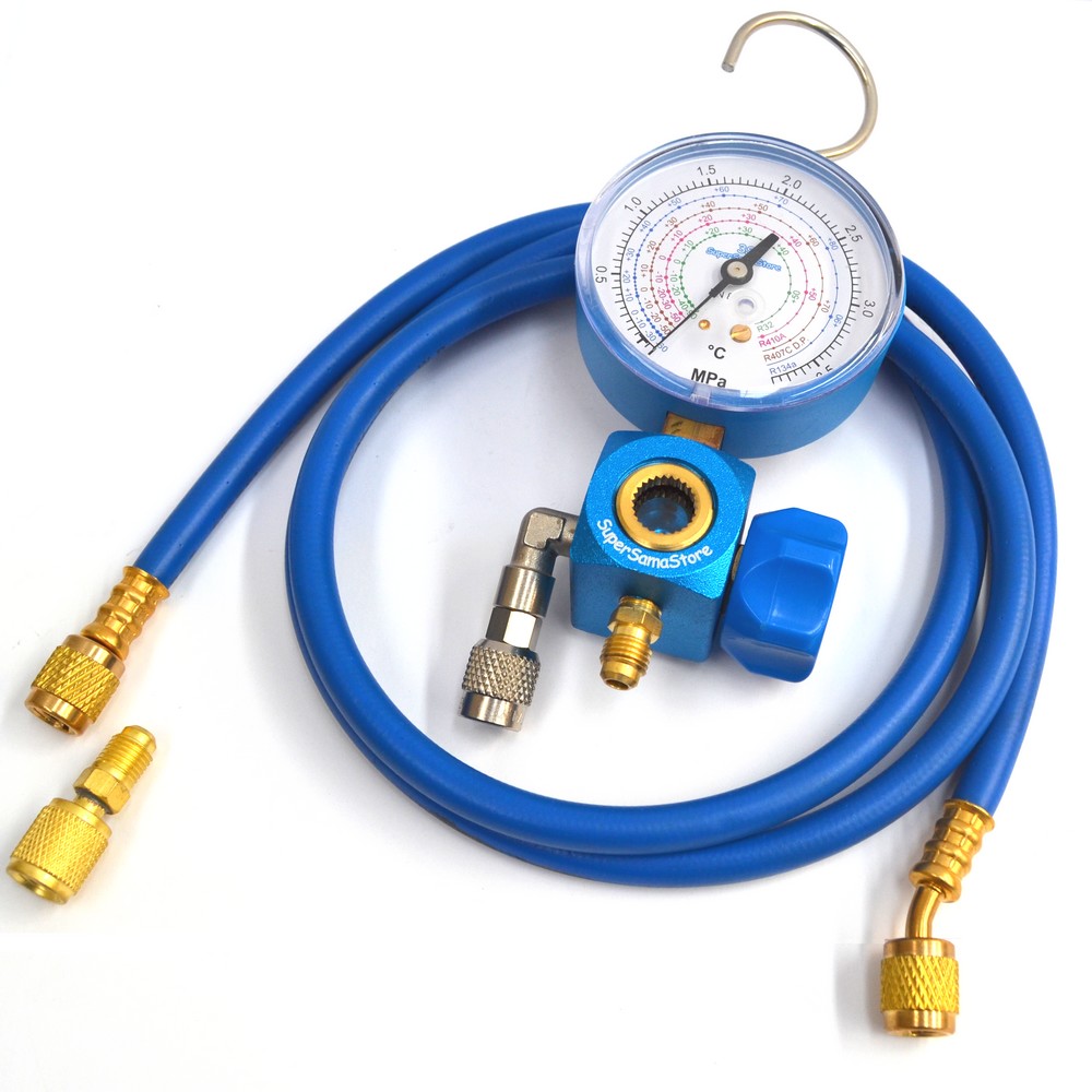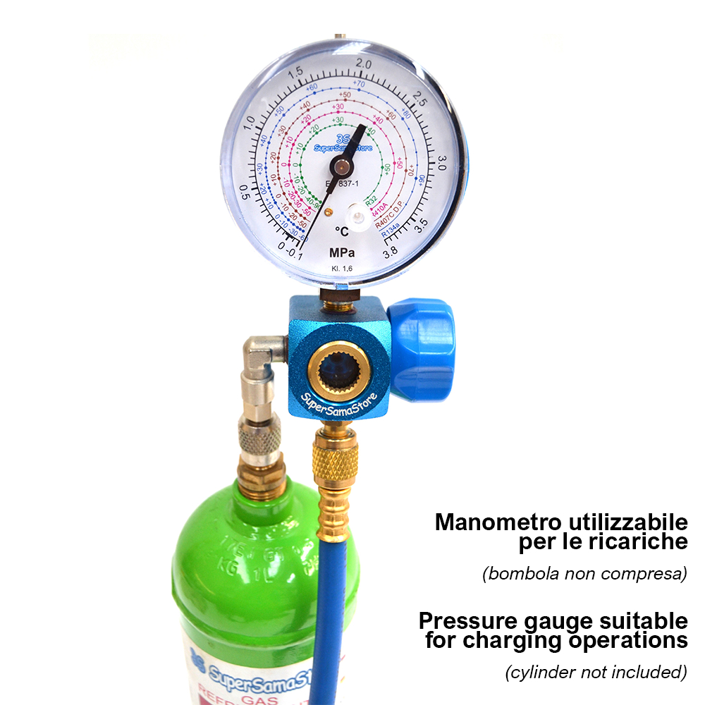 Il manometro e la frusta collegate ad una bombola di gas (non compresa), vi permetteranno di effettuare anche le ricariche del condizionatore testandone l’effettiva pressione dell’impianto