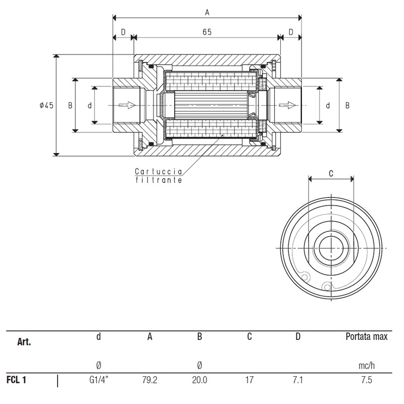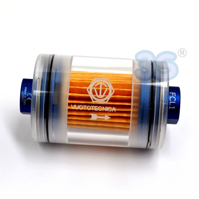 Sono costituiti da un corpo cilindrico in plexiglas trasparente, chiuso da due flange in alluminio anodizzato trattenute da anelli seeger, nelle quali sono ricavate le connessioni filettate femmina o maschio e alloggiate le guarnizioni di tenuta; al loro interno, è racchiusa la cartuccia filtrante in carta speciale trattata, con un grado di filtrazione pari a 7 μ, pieghettata per aumentarne la superficie filtrante.