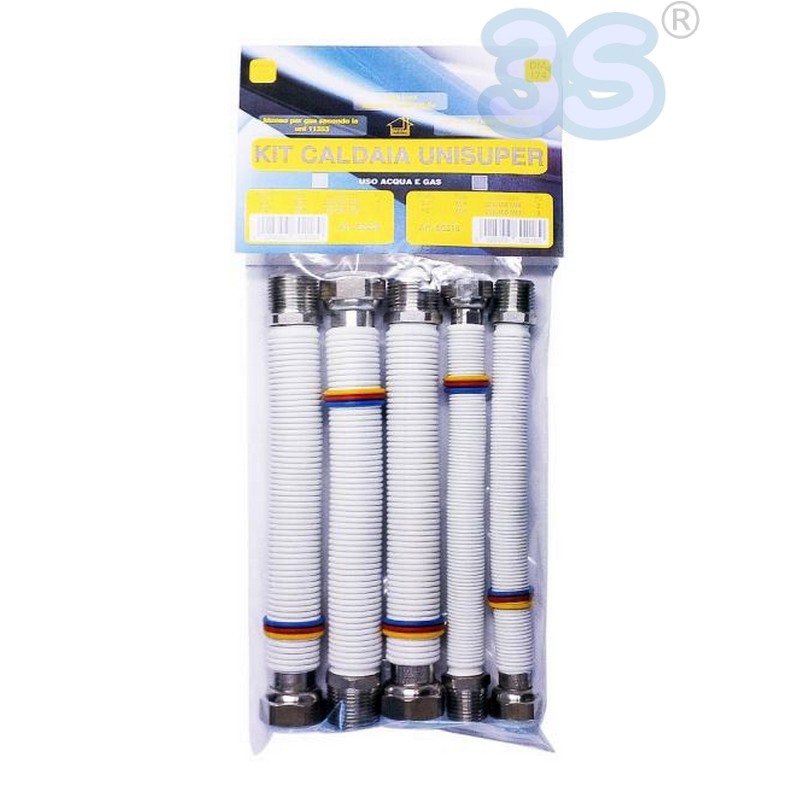 KIT COLLEGAMENTO CALDAIA ACQUA E GAS 5 TUBI ACCIAIO ESTENSIBILI DA 220 A 420 mm IL KIT COMPRENDE: • N° 1 Pz HD-FLEX 3/4″ 220-420 mm GAS • N° 2 Pz HD-WTER 3/4″ 220-420 mm ACQUA RIVESTITO • N° 2 Pz HD-WATER 3/4″ 220-420 mm ACQUA RIVESTITO Codice prodotto: 200-035-001-005