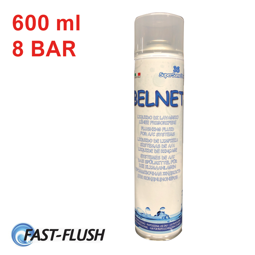 Belnet - bombola 600ml pressurizzata - nuovissimo sistema Fast-Flush Liquido detergente linee frigorifere Caratteristiche: Pulisce e risana vecchi impianti dove e necessario sostituire la tipolgia di gas refrigerante; Bombola da 600 ml - pressurizzata 8 bar / 116 psi; Cono in gomma, consente l'appoggio e la tenuta su tubi cartellati; Estremamente efficace; Compatibile con tutti i tupi di gas refrigerante; Compatibile con olii minerali , esteri e pag; Evapora facilmente (evaporazione totale in fase di vuoto).Pulisce e risana vecchi impianti dove e necessario sostituire la tipolgia di gas refrigerante; Bombola da 600 ml - pressurizzata 8 bar / 116 psi; Cono in gomma, consente l'appoggio e la tenuta su tubi cartellati; Estremamente efficace; Compatibile con tutti i tupi di gas refrigerante; Compatibile con olii minerali , esteri e pag; Evapora facilmente (evaporazione totale in fase di vuoto). Utilizzo: Appoggiare la punta a cono al tubo in rame cartellato che si intende sgrassare; Esercitare una leggera pressione sul fondo della bombola spingendola verso il tubo di rame; Fare uscire tanto liquido quanto necessario alla pulizia della tubazione che si sta trattando; Terminare la pressione sulla bombola una volta sgrassata la tubazione; Una bombola e' sufficiente per pulire e sgrassare linee frigorifere di circa 6-7 mt; La pressione della bombola e' costante sino al suo completo svuotamento. Codice prodotto: BEL.C600